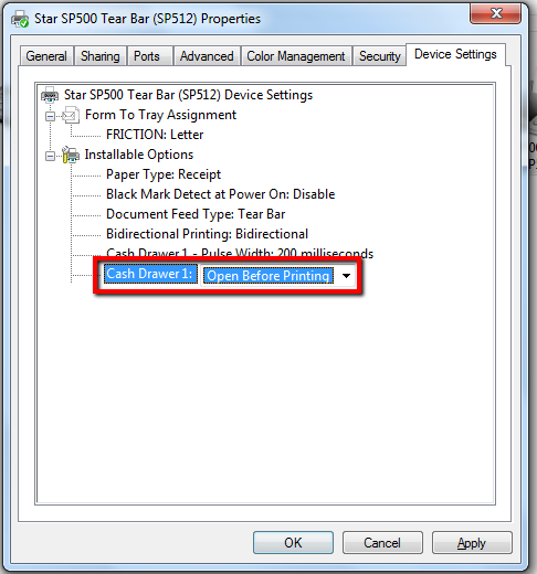 Set Cash Drawer 1 under Installable Options to Open Before Printing.