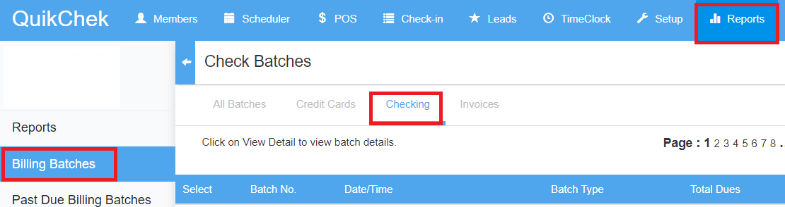 1. Please click Reports and click Billing Batches on the left side. Then click Checking.