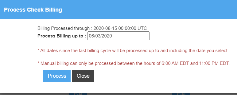 3. Click Manually Process Billing. Enter the bill date you're processing for.